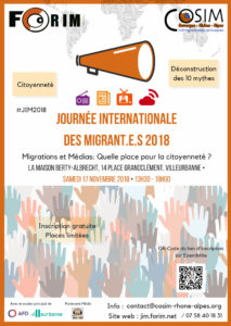 Migrations & Médias JOURNÉE INTERNATIONALE DES MIGRANT.E.S 2018 Citoyenneté – Déconstruction des 10 mythes Maison Berty Albrecht, 14 Place Granclément, 69100 Villeurbanne. samedi 17 novembre…