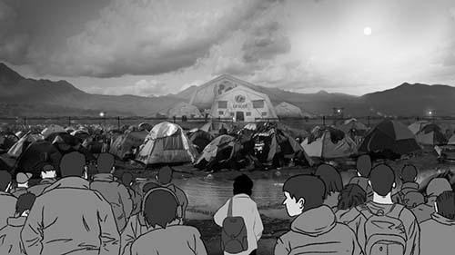 Plusieurs réfugiés, arrivés à Calais au péril de leur vie, dénoncent la violence de la condition qui leur est imposée. Leurs voix se superposent à des images de la « jungle » et de l’architecture carcérale du nouveau camp construit par l’État français.
