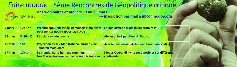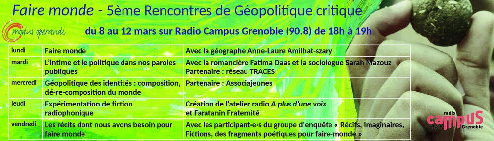 Dans le cadre des 5e rencontres de géopolitique critique « FAIRE MONDE », qui ont lieu du 8 au 19 mars 2021, organisées par MODUS OPERANDI, en partenariat avec Radio Campus Grenoble, PACTE – Justice sociale Laboratoire de Sciences sociales, et de nombreux autres partenaires.