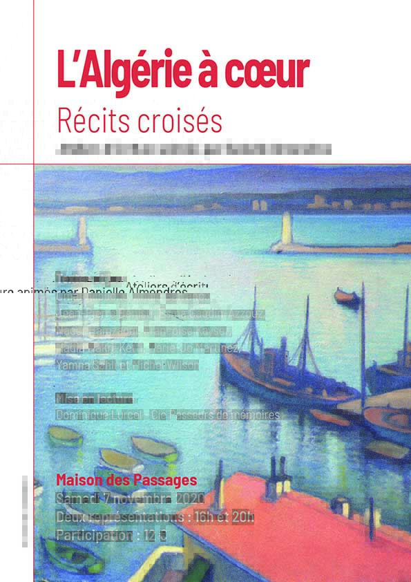 Danielle Almendros : « Voilà trois ans que j’anime des ateliers d’écriture au sein de Coup de Soleil avec des personnes ayant pour point commun d’avoir l’Algérie à cœur, soit pour y être nées, ou avoir des ascendants qui y ont vu le jour. Dans ces groupes, se retrouve la diversité des populations de ce pays, algériens des rives de la méditerranée aux montagnes de la Kabylie et pieds-noirs d’origines diverses.